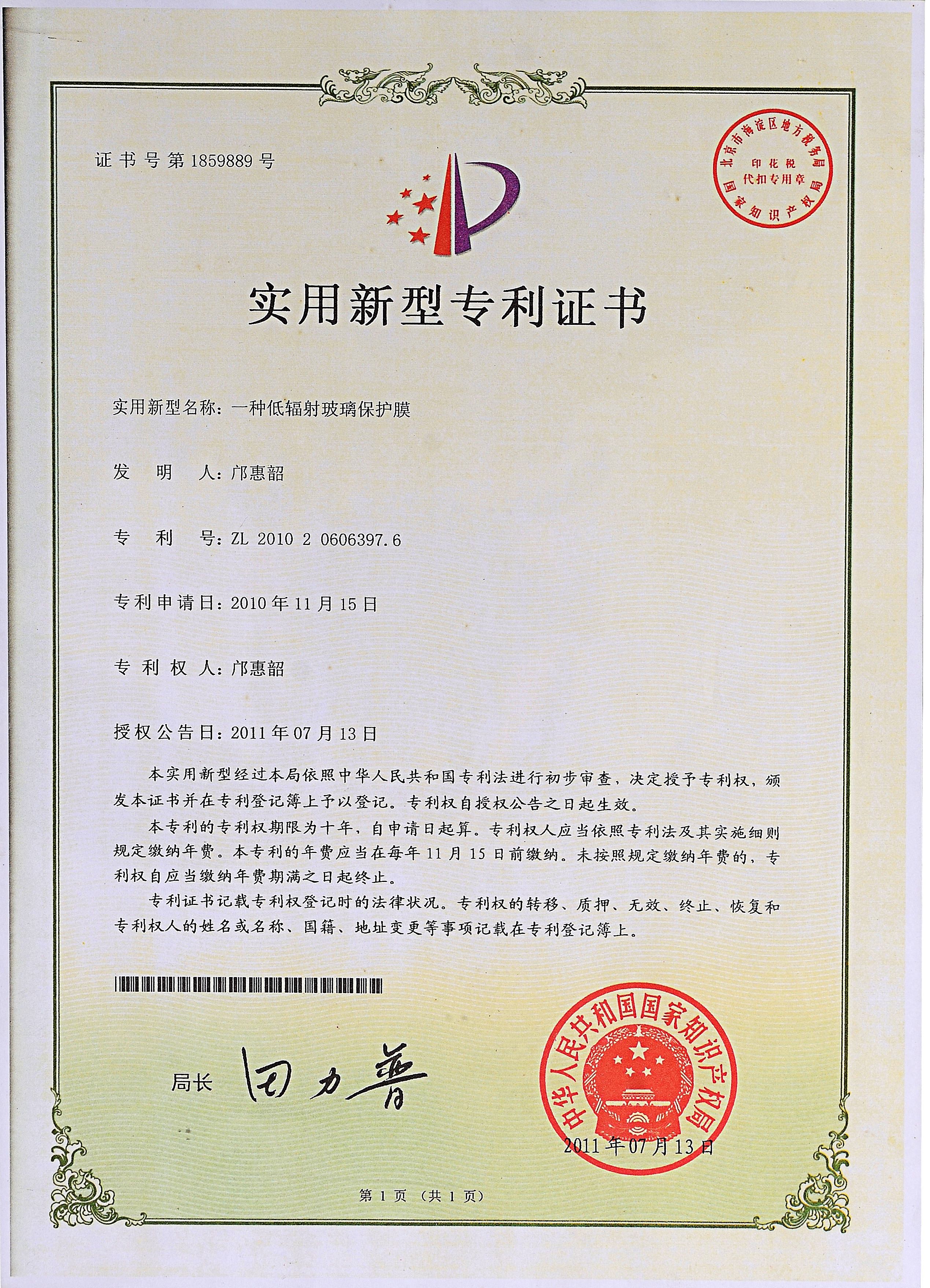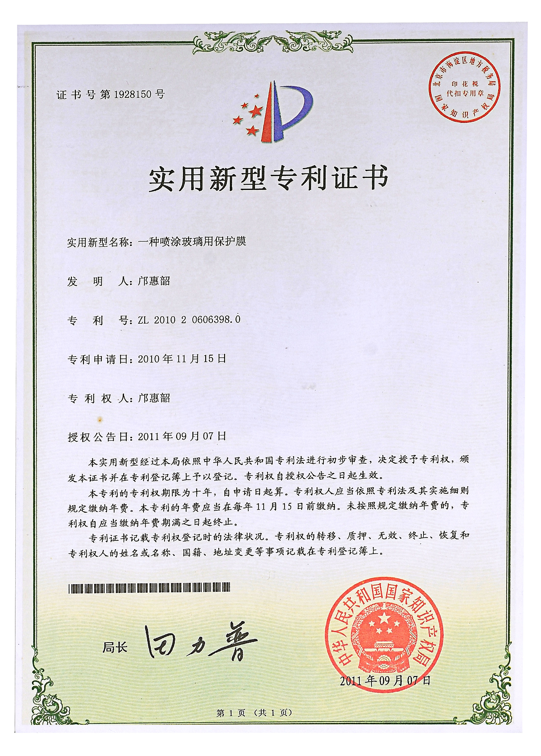 佛山分廠成立,中國(guó)第一臺(tái)超幅寬涂布機(jī)生產(chǎn)線投產(chǎn),并增添1臺(tái)幅寬2.8M的吹膜機(jī),專力打造原板Low-E玻璃保護(hù)膜成為中國(guó)第一膜,并獲得了實(shí)用新型專利證書(shū)。